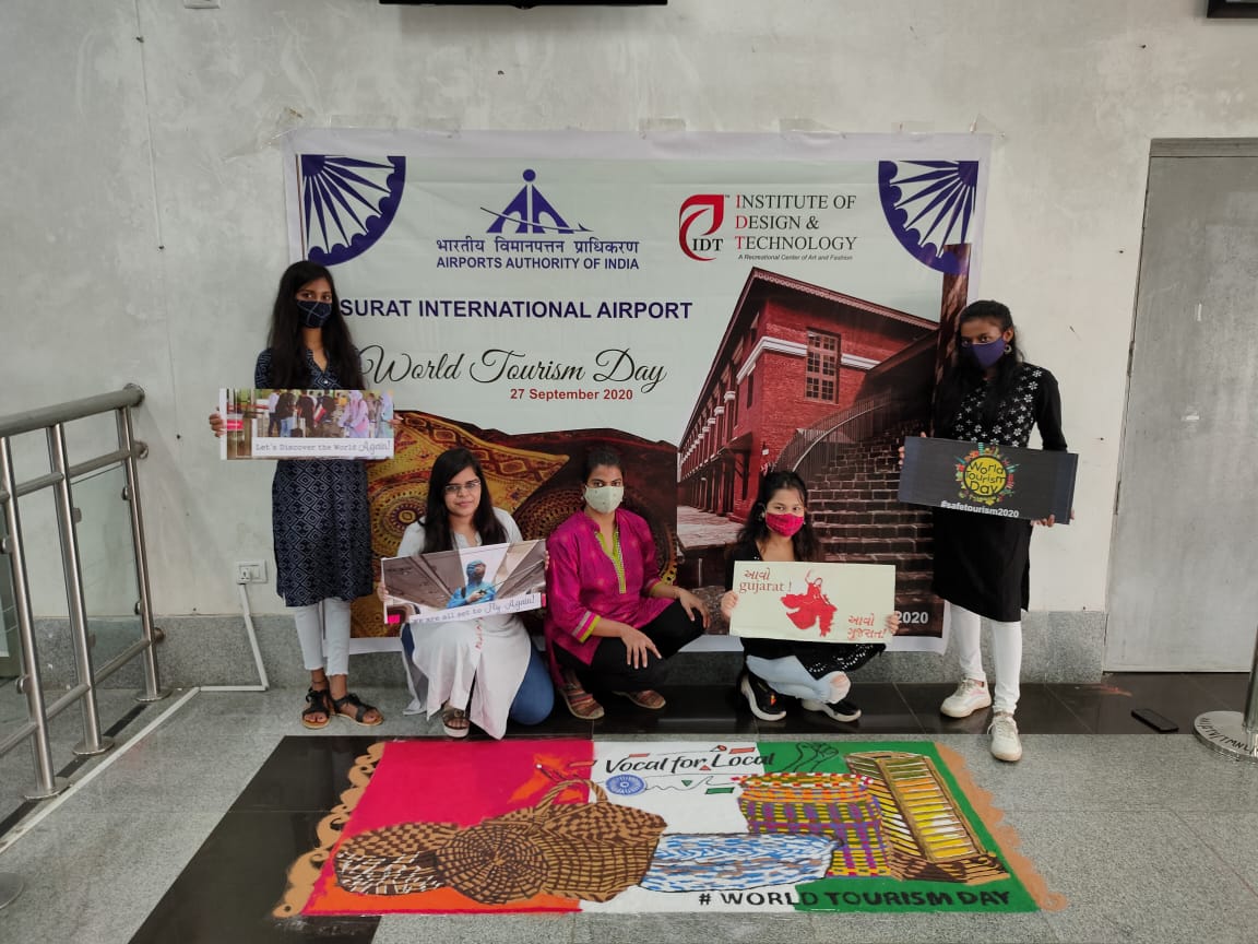 સુરત : વિશ્વ પર્યટન દિવસ નિમિત્તે સુરત સ્થિત ફેશન અને આંતરીક ડિઝાઇન શિક્ષણ કેન્દ્ર આઈડીટી દ્વારા સુરત આંતરરાષ્ટ્રીય વિમાનમથક પર ઉજવણી દ્વારા સલામત મુસાફરીનો સંદેશો આપીને સુરતમાં પ્રવાસીઓના આગમનને પ્રોત્સાહન આપવામાં આવ્યું છે.